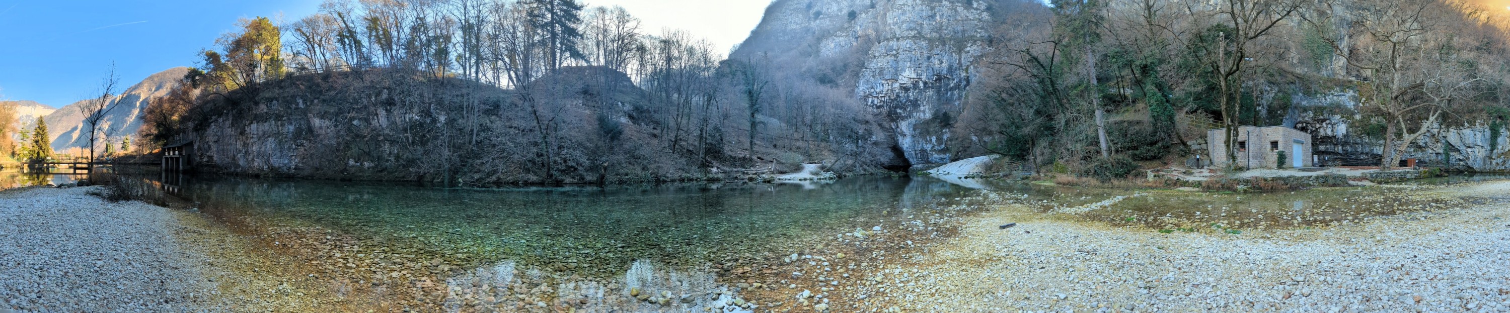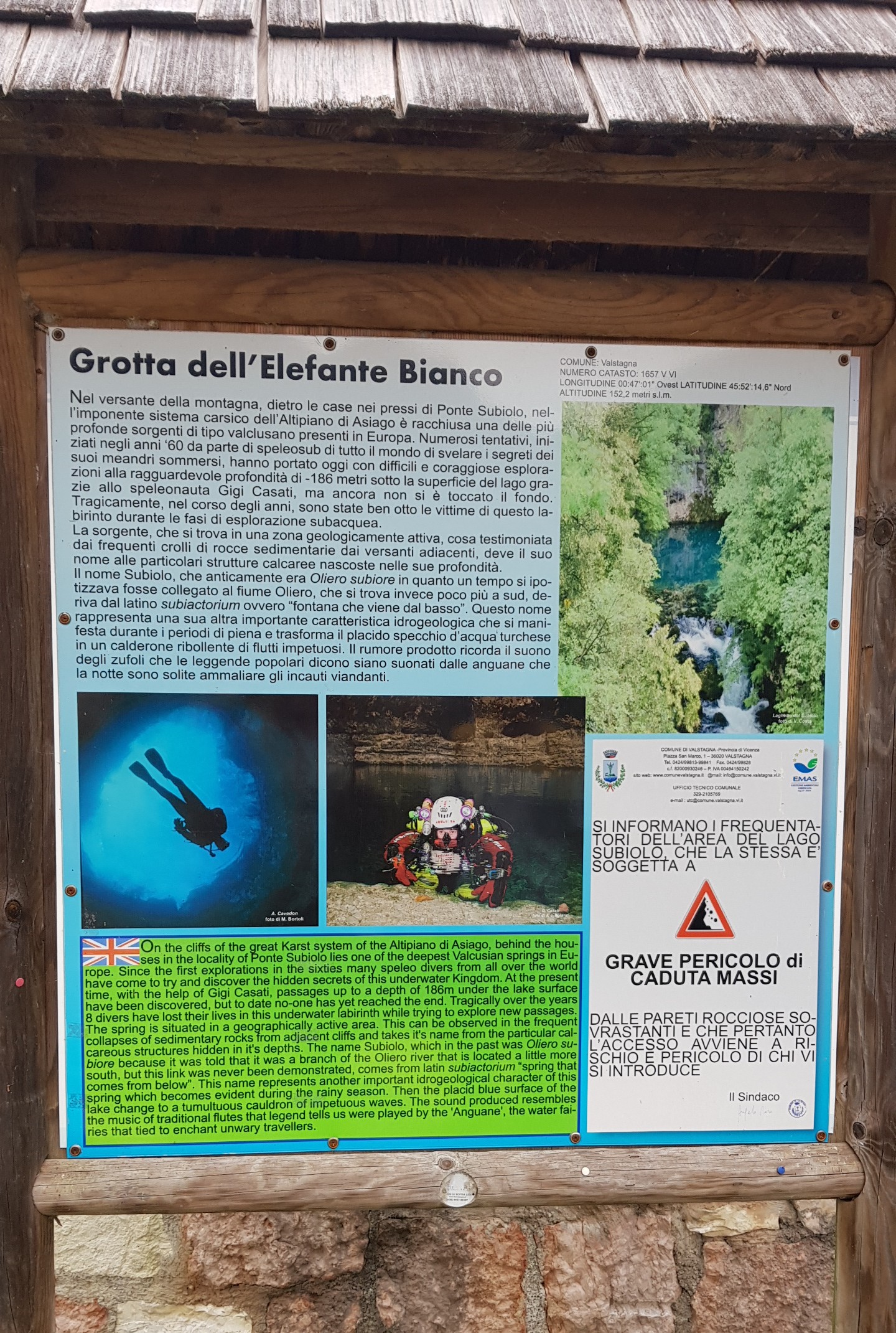 Die zwei Mundlöcher, Covol dei Siori (ital. Höhle des Herren) und Covol dei Veci (ital. Höhle des Wächters), sind etwa 150 m voneinander entfernt und nur betauchbar, wenn die fast permanent heraus fließenden Wassermassen eine Gnadenpause für die Taucher einlegen. Wir hatten Glück und die Tauchbedingungen waren an dem Tag exzellent. Die Sicht betrug etwa 10-12 m und die Strömung war nur in Siori bemerkbar.