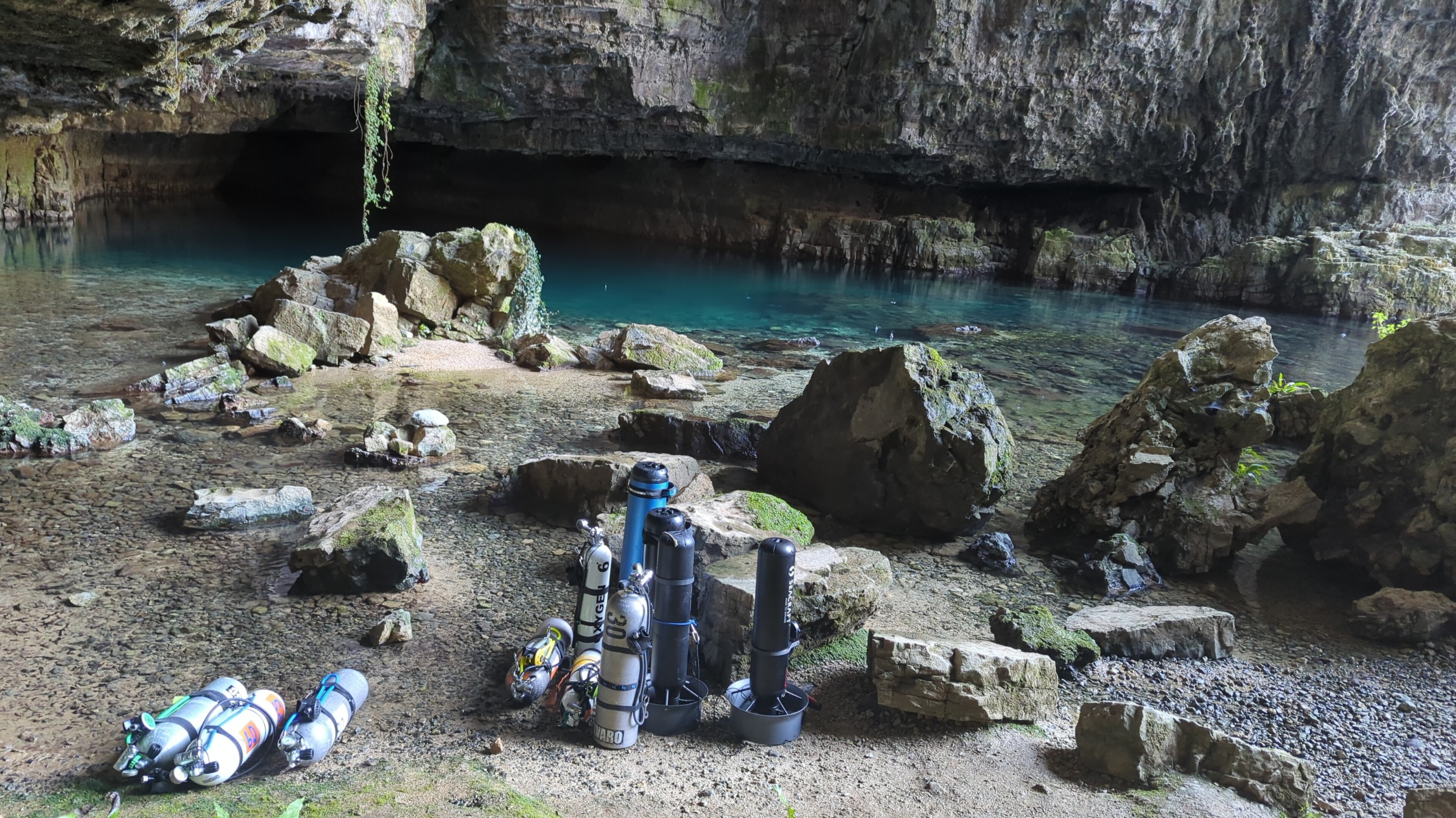 Am Samstag sind wir gleich nach dem Frühstück die paar Kilometer nach Grotta dei Fontanazzi gefahren. Fontanazzi gilt für viele als eine der schönsten Tauchhöhlen Europas. Entsprechend hoch waren unsere Erwartungen. Die Tauch- und Wetterbedingungen waren an dem Tag perfekt. Nach der üblichen Schlepperei der Ausrüstung bis zum Einstiegspunkt waren wir bereit. Die Höhle fing mit drei Engstellen in 6, 11 und 18 m Tiefe an, die eine gewisse Technik und vor allem einen ruhigen Kopf bzw. Geduld voraussetzen. Alex ging als erster mit Sidemount-OC hinein und konnte die Engstellen schnell überwinden. Philipp und ich mit den Backmount-Rebreathern hatten wesentlich mehr zu tun, um die letzten zwei Engstellen zu passieren. Die unvermeidbaren Kratzer an der Ausrüstung waren aber dank des atemberaubenden Blicks sehr schnell vergessen.