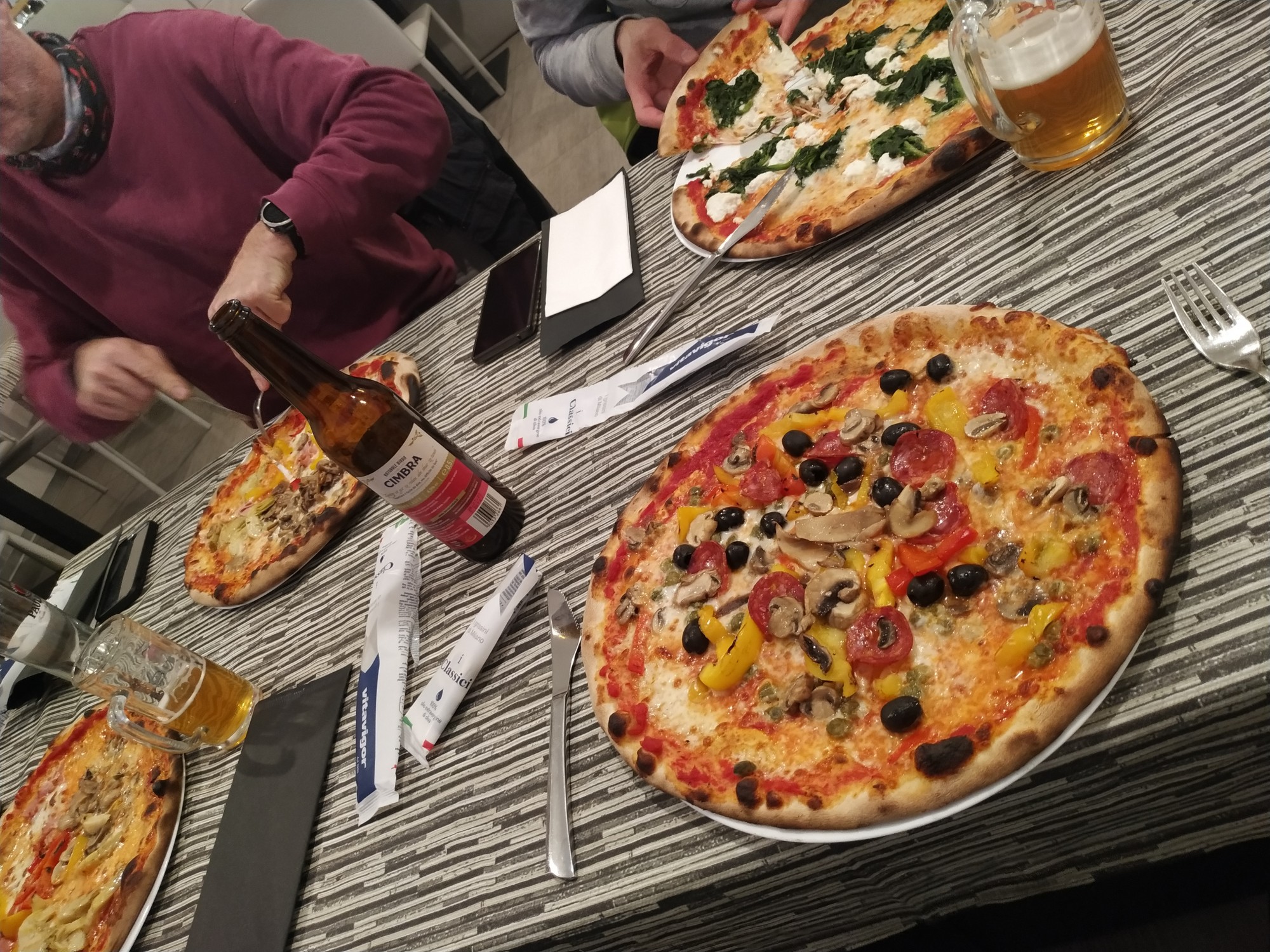 Nach kurzer Abwägung unserer Prioritäten und angesichts der fortschreitenden Unterhopfung hielten wir an einer Pizzeria kurz vor der Unterkunft, riefen Frank & Philipp an, die wenige Minuten vor uns das Ziel erreicht hatten, und aßen zusammen Abendbrot.