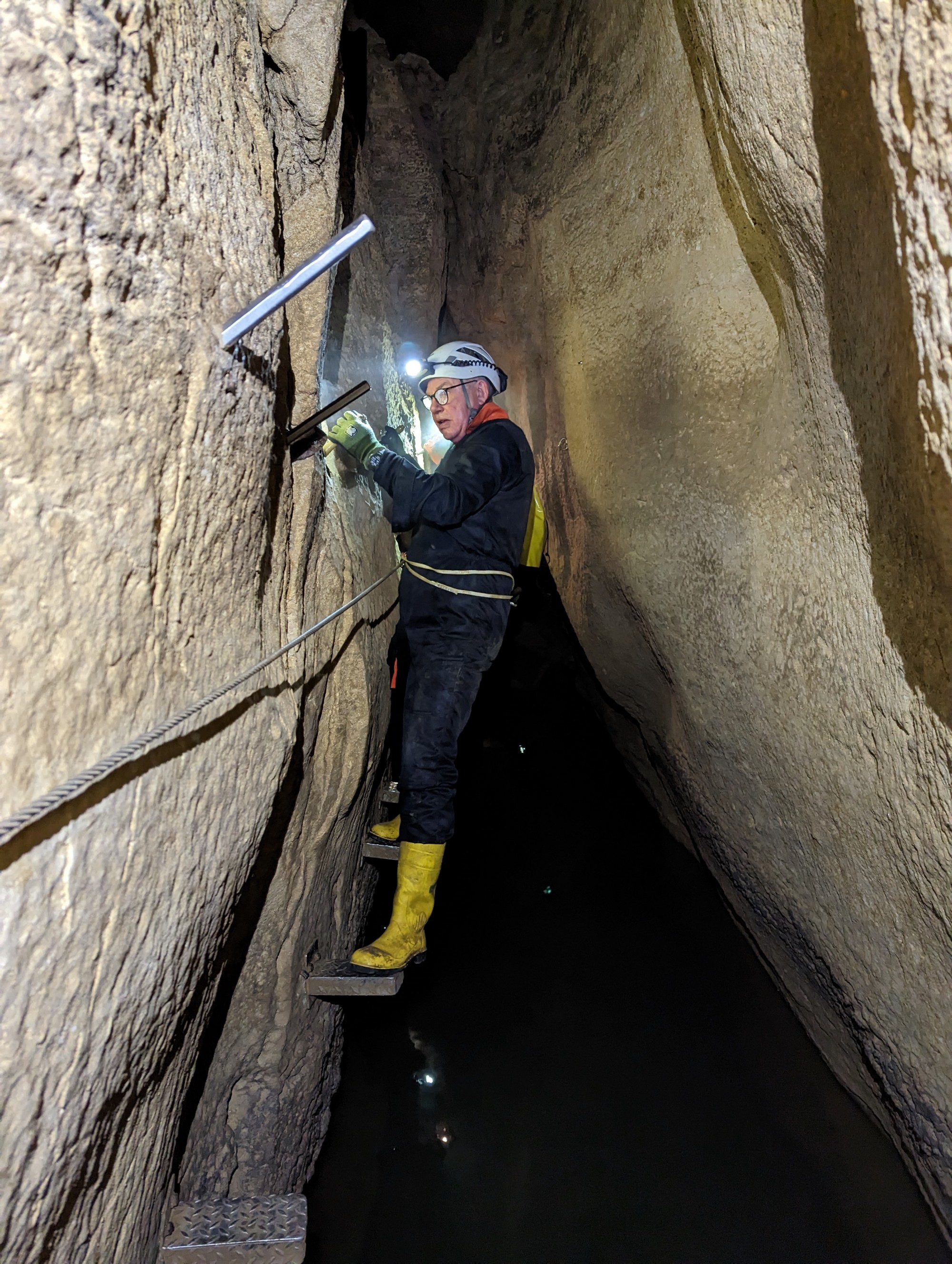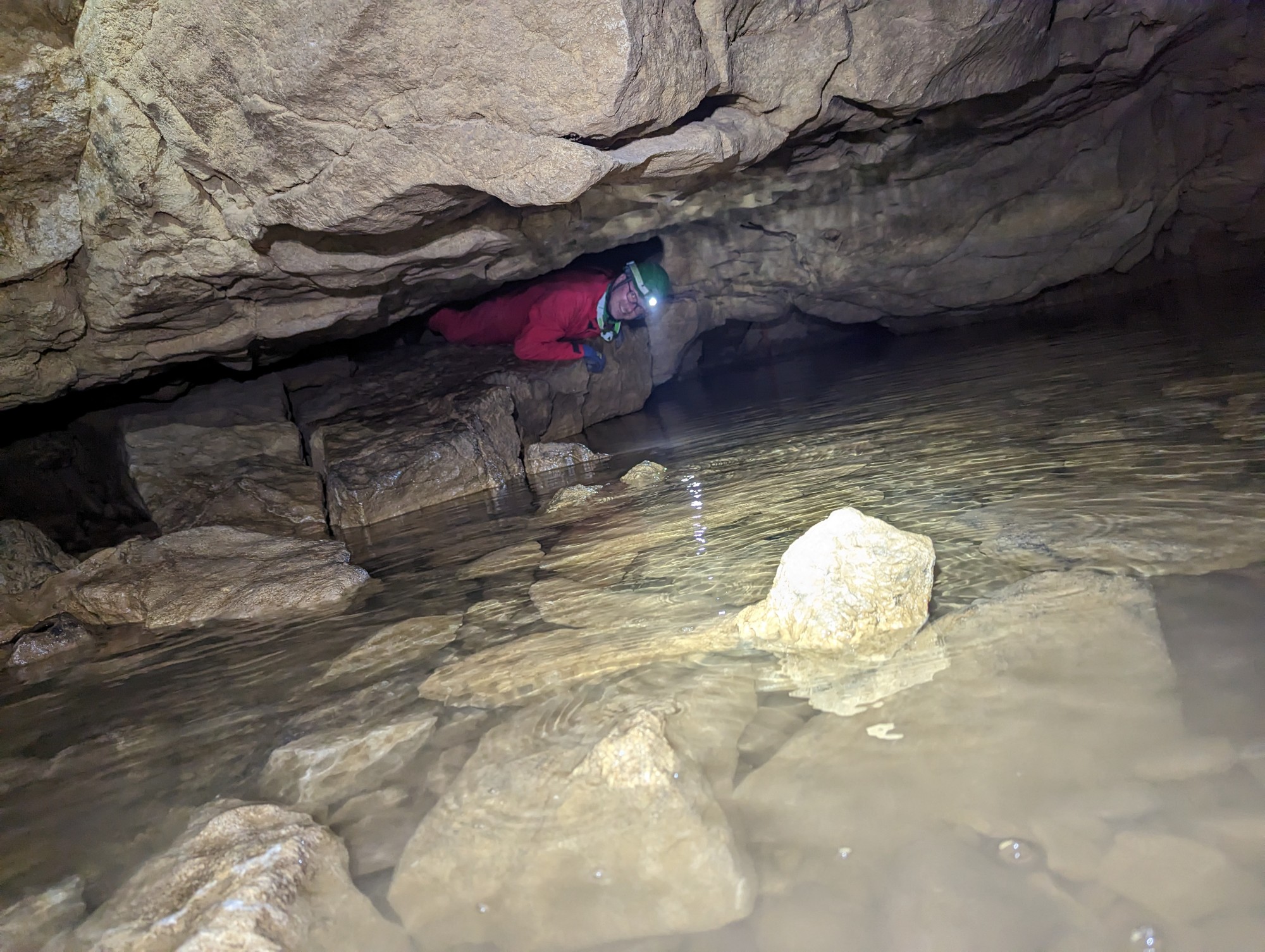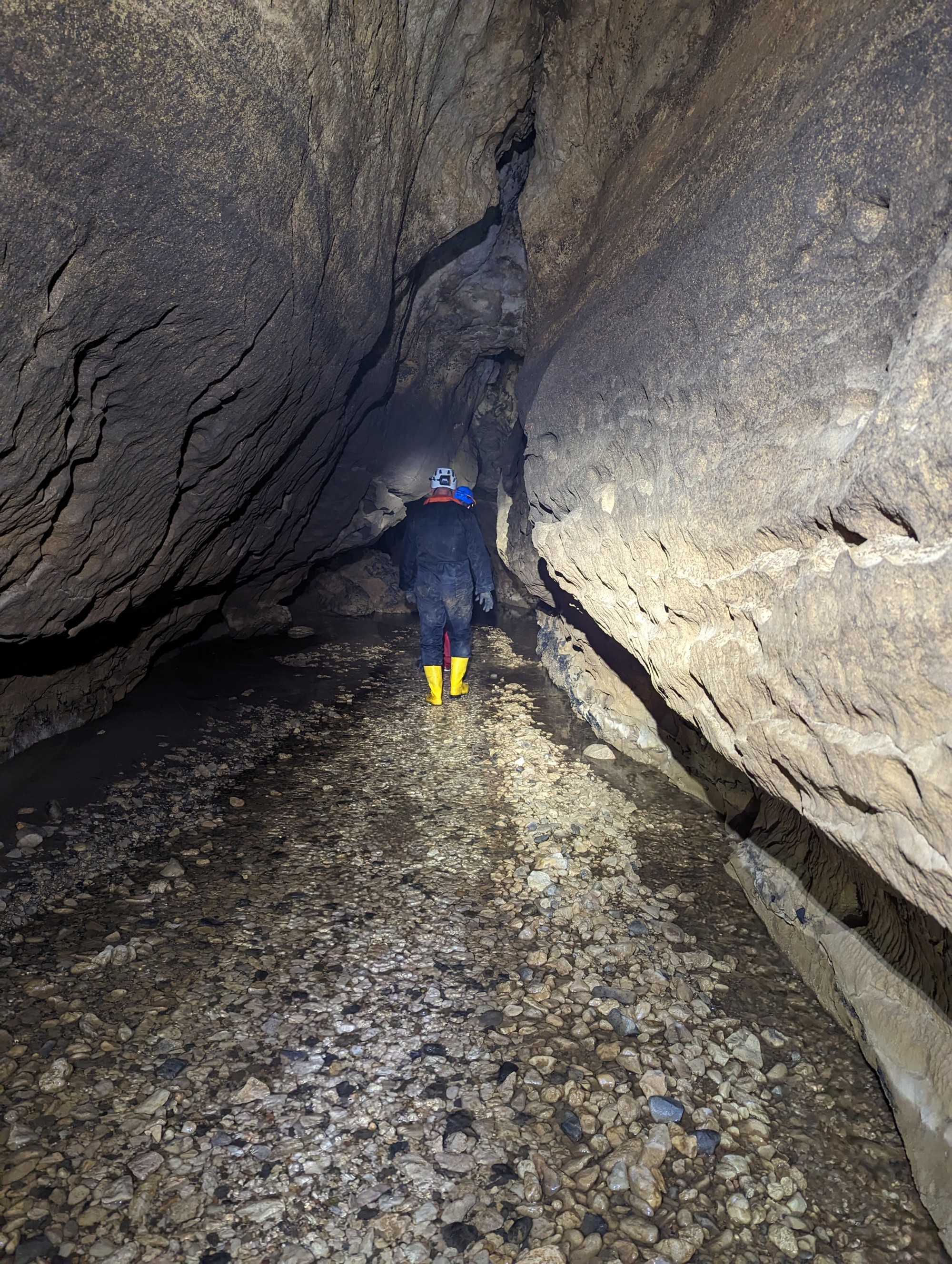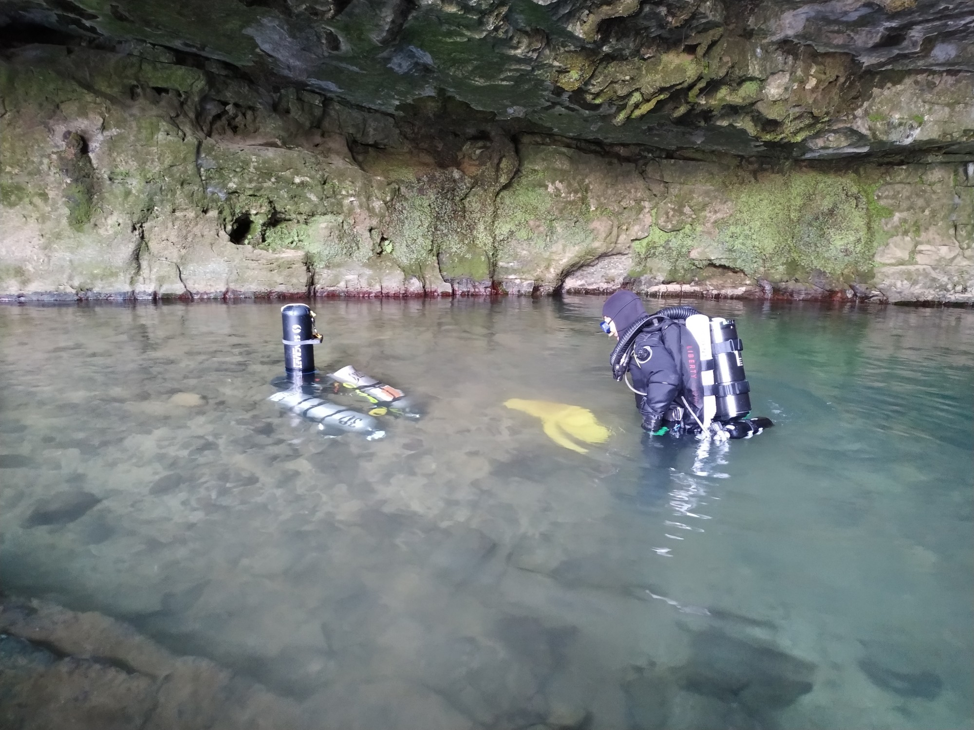 Unsere ersten Tauchgänge in Oliero dienten lediglich dem Vertrautmachen mit den logistischen und technischen Gegebenheiten vor Ort. So sind wir nach zwei Anläufen durch den großräumigen Hauptgang mit den Scootern bis zum ersten T gefahren. Das befindet sich kurz nach der tiefsten Stelle von S1 mit -57 m Tiefe, welche man nach etwa 18 min gemütlicher Fahrt erreicht. Die Dekozeit betrug am Ende des zweiten Tauchgangs um die 30 min und das Wasser war 8-9°C warm. Trotz einer aufmerksamen Suche während der Deko konnten wir leider keine der in Oliero eingeführten Grottenolme besichtigen.