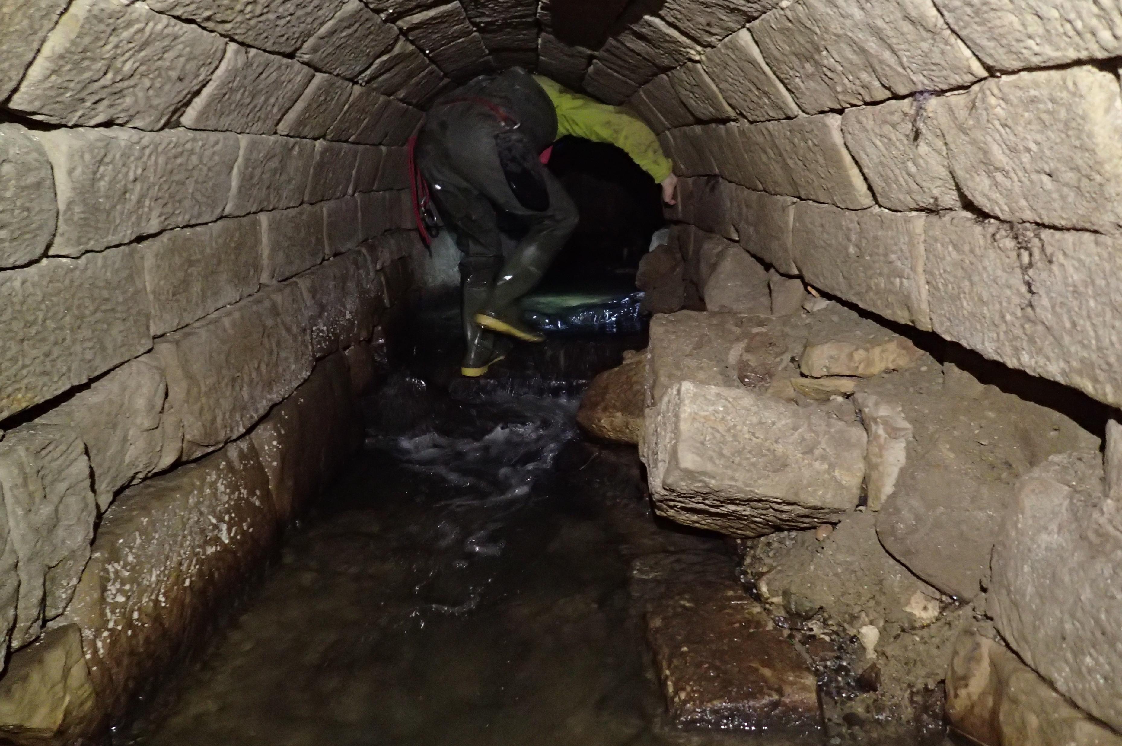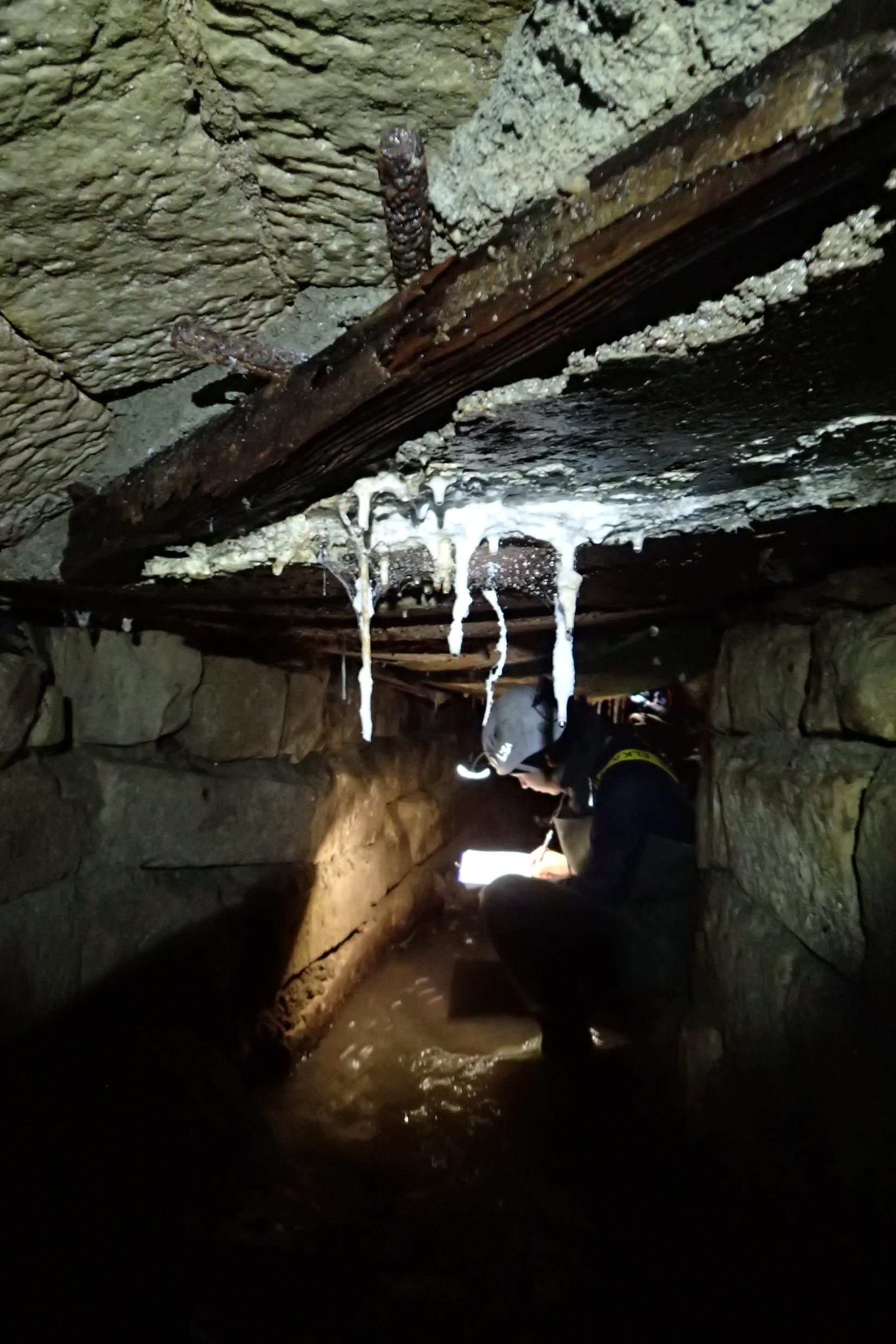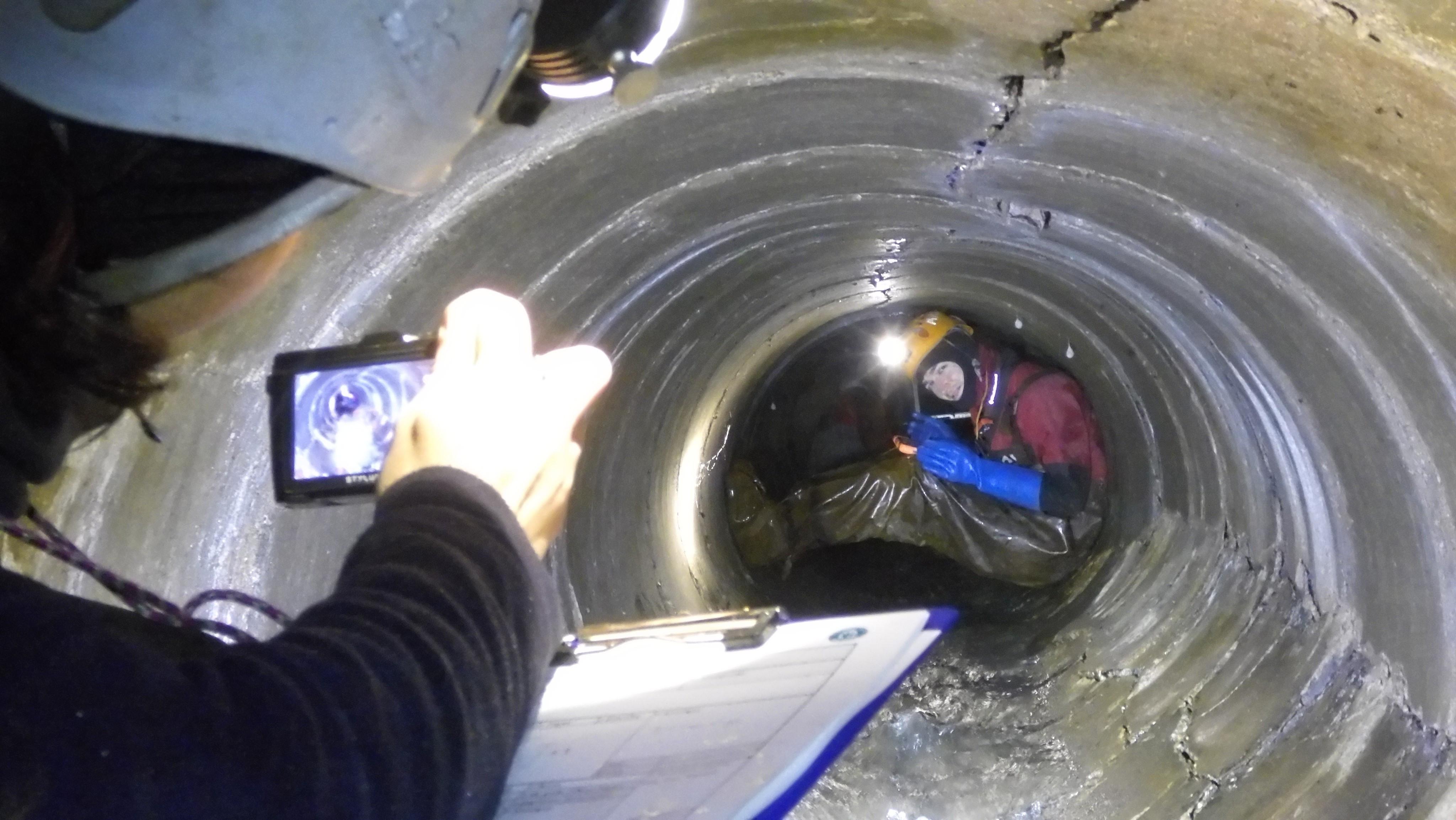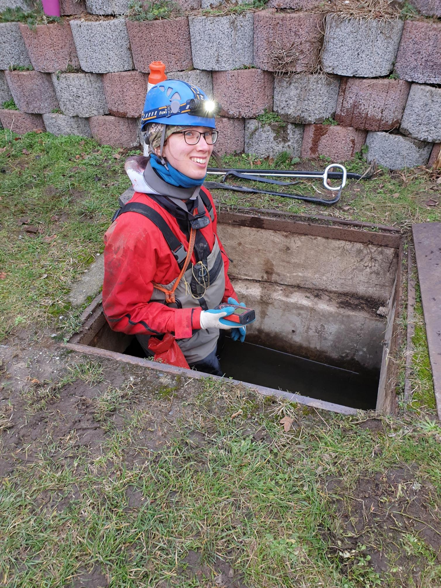 Der Stollen führte reichlich Wasser, so dass wir uns mit Wathose und Neopren einkleiden mussten. Christina und Max führten die Vermessung durch. Dabei verwendete Christina ein elektronisches Messgerät und Max dokumentierte alle Daten, sowie skizzierte markante Punkte auf dem Tablet. Lisa dokumentierte die Schäden und erstellte Skizzen, auf den von ihr entworfenen Befahrungsprotokollen. Hartmut suchte über Tage nach den „Lichtlöchern“- Entwässerungschächten bzw. Einläufen und dokumentierte diese, die wir auch immer zum Aus- und Einstieg benötigten. Natürlich auch für die eindeutige Vermessung. Und er stellte uns die Leiter in die Schächte, was das Aus- und Einsteigen enorm erleichterte.