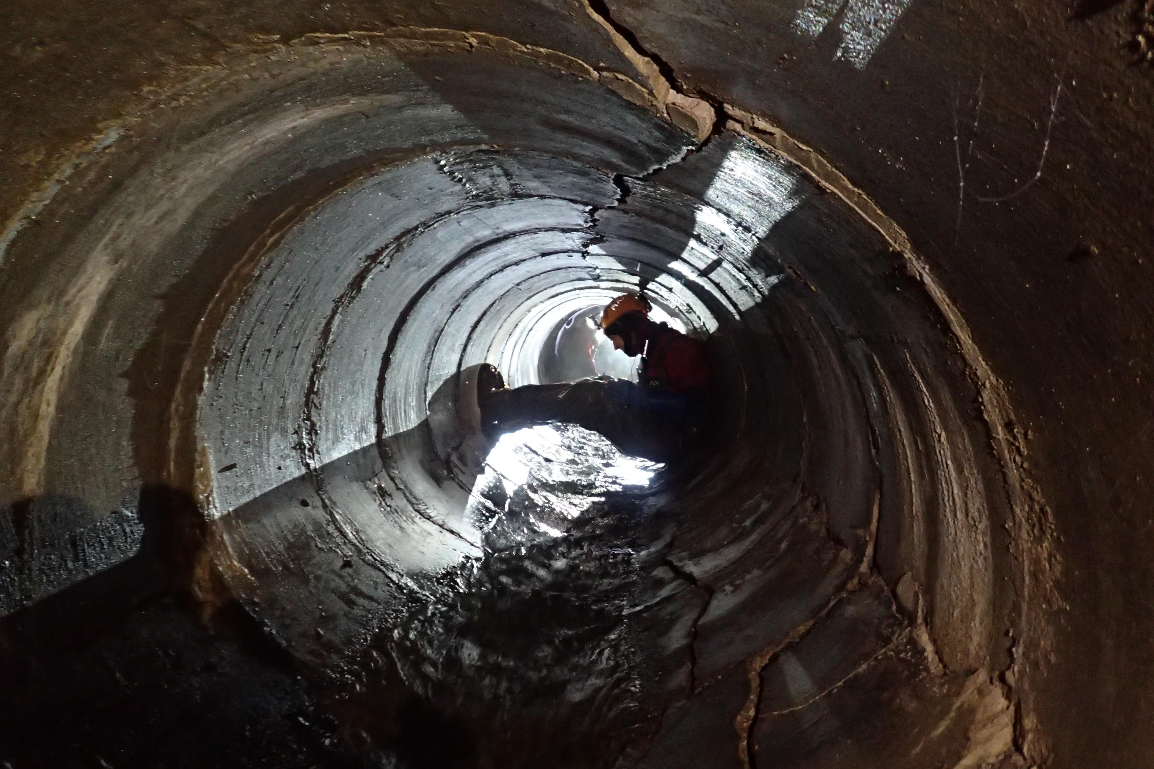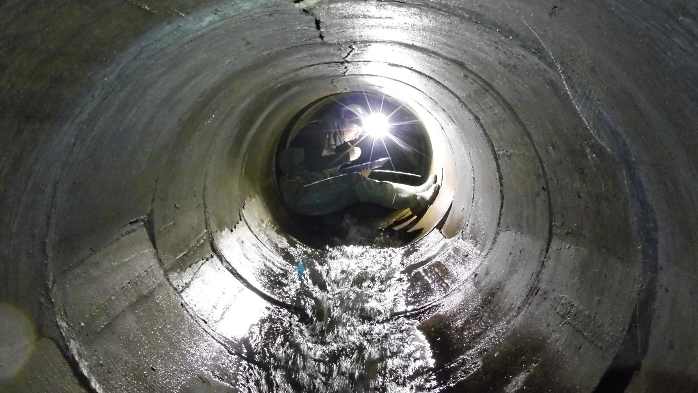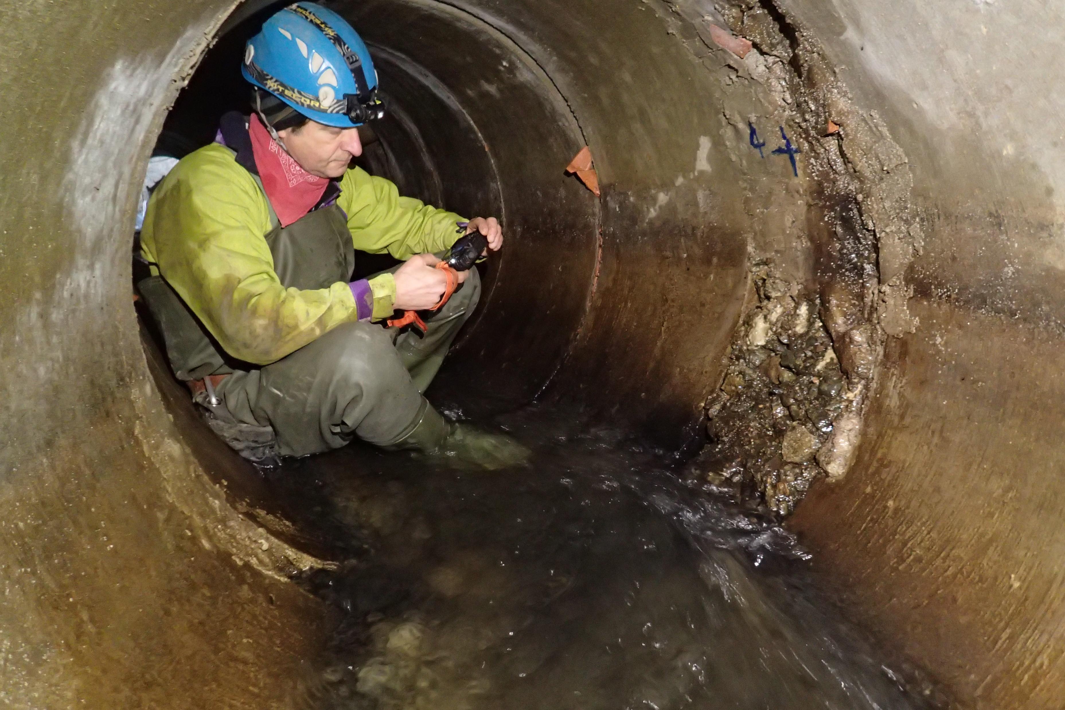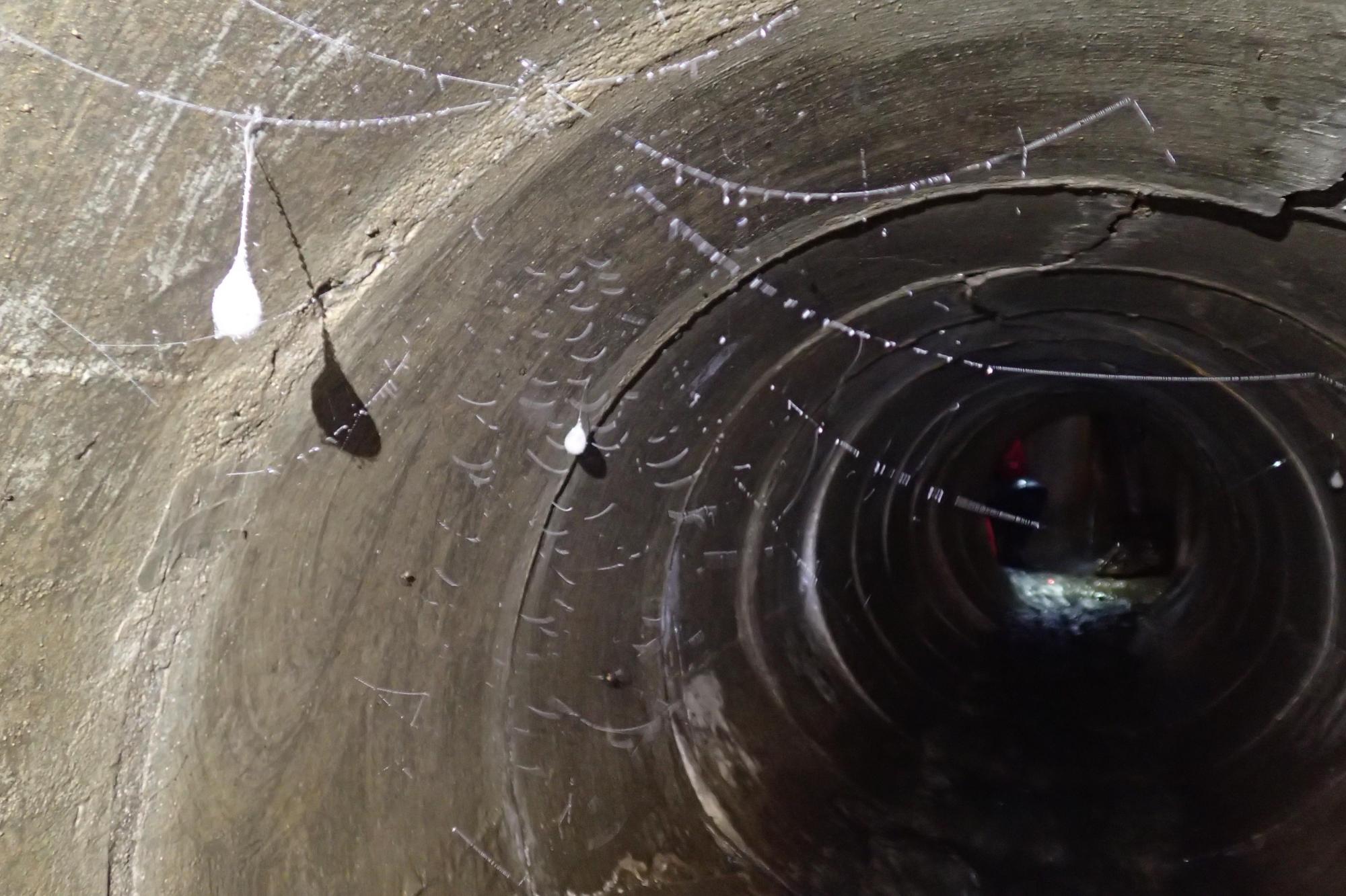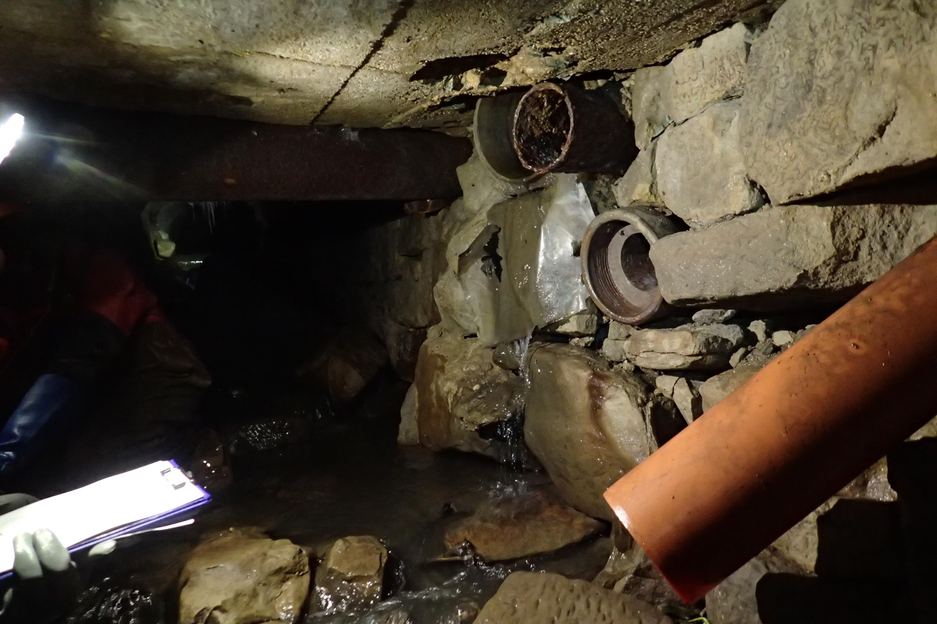 Der Stollen führte reichlich Wasser, so dass wir uns mit Wathose und Neopren einkleiden mussten. Christina und Max führten die Vermessung durch. Dabei verwendete Christina ein elektronisches Messgerät und Max dokumentierte alle Daten, sowie skizzierte markante Punkte auf dem Tablet. Lisa dokumentierte die Schäden und erstellte Skizzen, auf den von ihr entworfenen Befahrungsprotokollen. Hartmut suchte über Tage nach den „Lichtlöchern“- Entwässerungschächten bzw. Einläufen und dokumentierte diese, die wir auch immer zum Aus- und Einstieg benötigten. Natürlich auch für die eindeutige Vermessung. Und er stellte uns die Leiter in die Schächte, was das Aus- und Einsteigen enorm erleichterte.