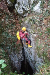 Bei der vorbereitenden Recherche stießen wir auf die Höhle Abisso Plutone mit der niedrigen Katasternummer VG89. Die 190m tiefe Schachthöhle wurde wahrscheinlich im Jahr 1894 das erste Mal befahren, was eine große Leistung war, das der Eingangsschacht etwa 115m senkrecht in den Abgrund führt. Die Höhle wurde schnall gefunden. Eine Befahrung war für dieses Mal nicht geplant und so sind wir nach ein paar weiteren Erkundungen in der nahem Umgebung weitergezogen.