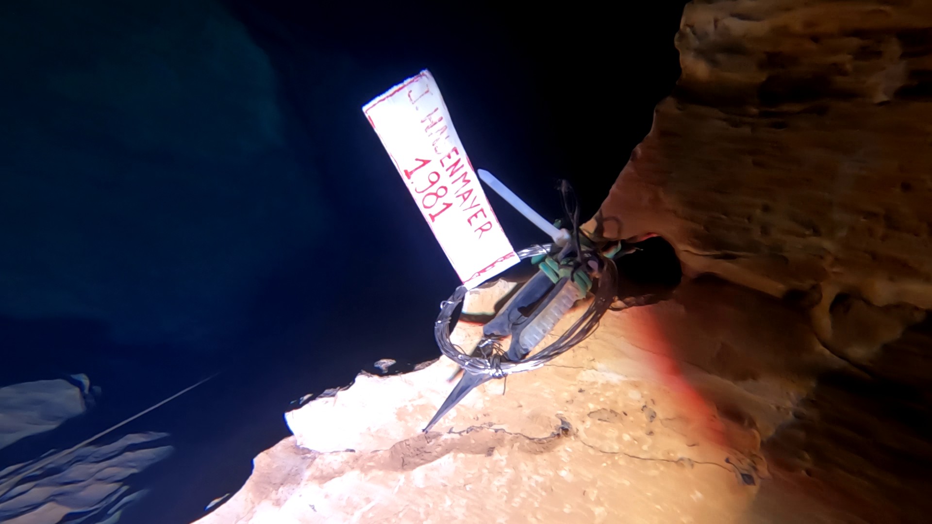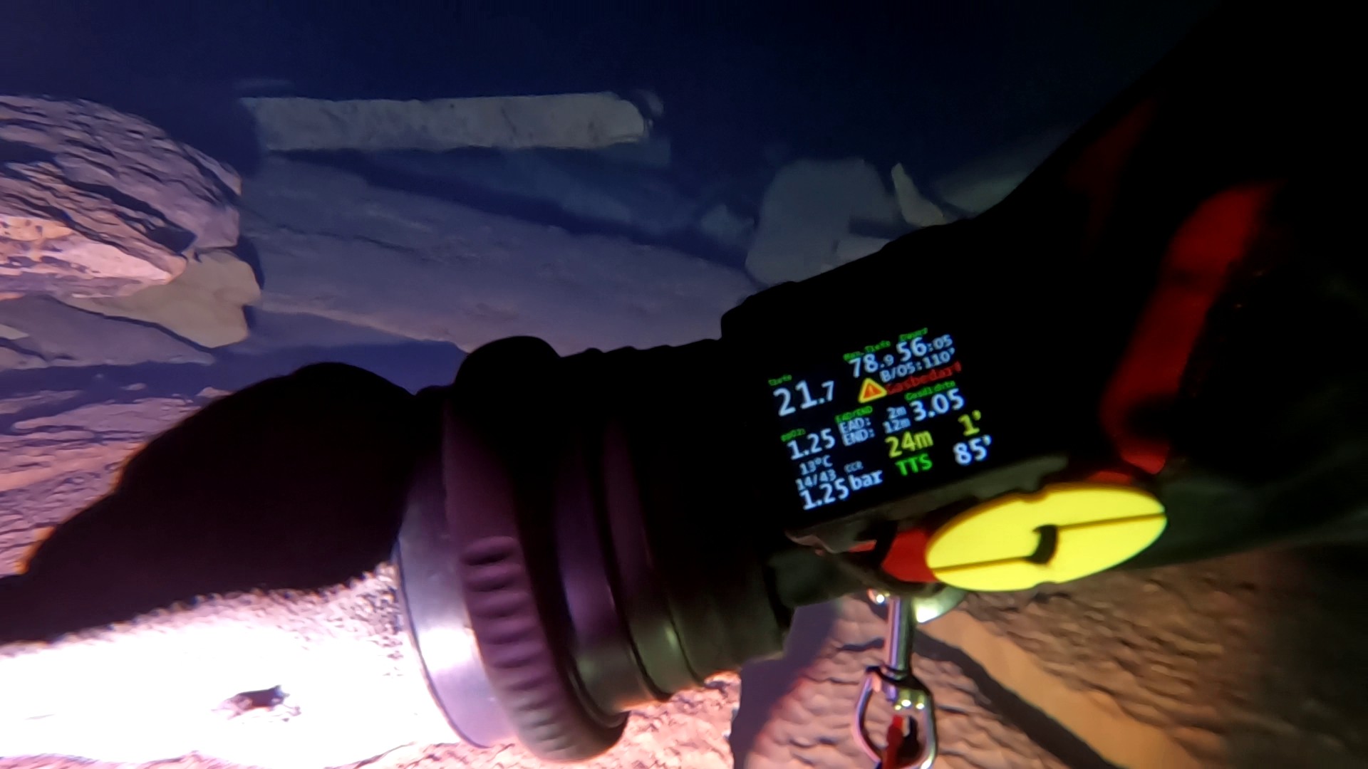 Am Montag haben wir die Landenouse angesteuert. Nach kurzem Verhandeln mit einer spanischen Gruppe wegen des Parkplatzes konnten wir eine Parklücke für uns sichern und dem Tauchgang stand nichts mehr im Wege. Unter sehr guten Sichtverhältnissen sind wir abgetaucht. Nach etwa 40 Minuten standen wir kurz vor dem tiefen Schacht. Maik, der kein Diluent für größere Tiefen hatte, wartete in 29m Tiefe während Alex und ich den Hang hinunter fuhren. In 60m war meine halbgefüllte Anzugflasche leer und ich warte an der Stelle bis Alex kurz die 75m Marke erreichte und umkehrte. Wir waren 127 Minuten unterwegs.