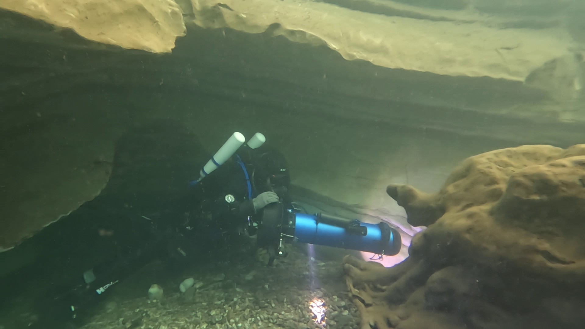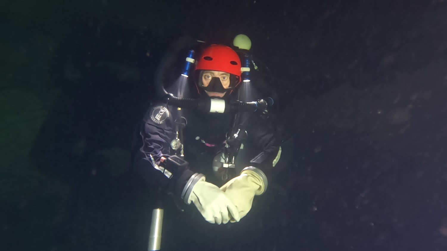 Am Sonntag wollten wir ein Stück weiter vorstoßen. Während Maik es bevorzugte eine Runde mit seinem Rennrad zu drehen, fuhr Alex und ich nochmal an die Ressel und wir wiederholten den Tauchgang vom Vortag. Diesmal nahmen wir die Abzweigung nach rechts am dritten T und fuhren weiter. Binnen einiger Minuten erreichten wir die Schere, die Hasenmayer im Jahr 1981 an dieser Stelle hinterließ und ein paar Minuten später waren wir am blauen Rohr, das jemand zum Wasserabsaugen eingebohrt hat, angekommen. An diesem Punkt drehten wir um. Der Tauchgang dauerte 156 Minuten mit einer maximalen Tiefe von 60m.