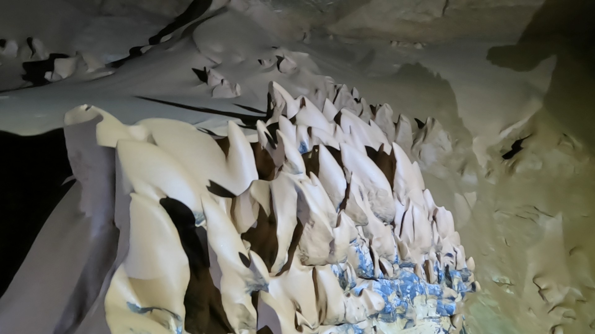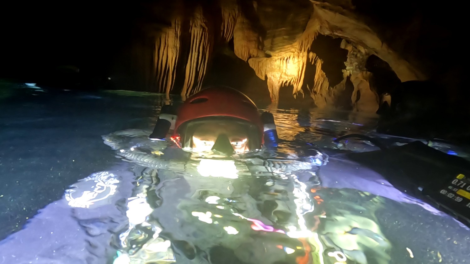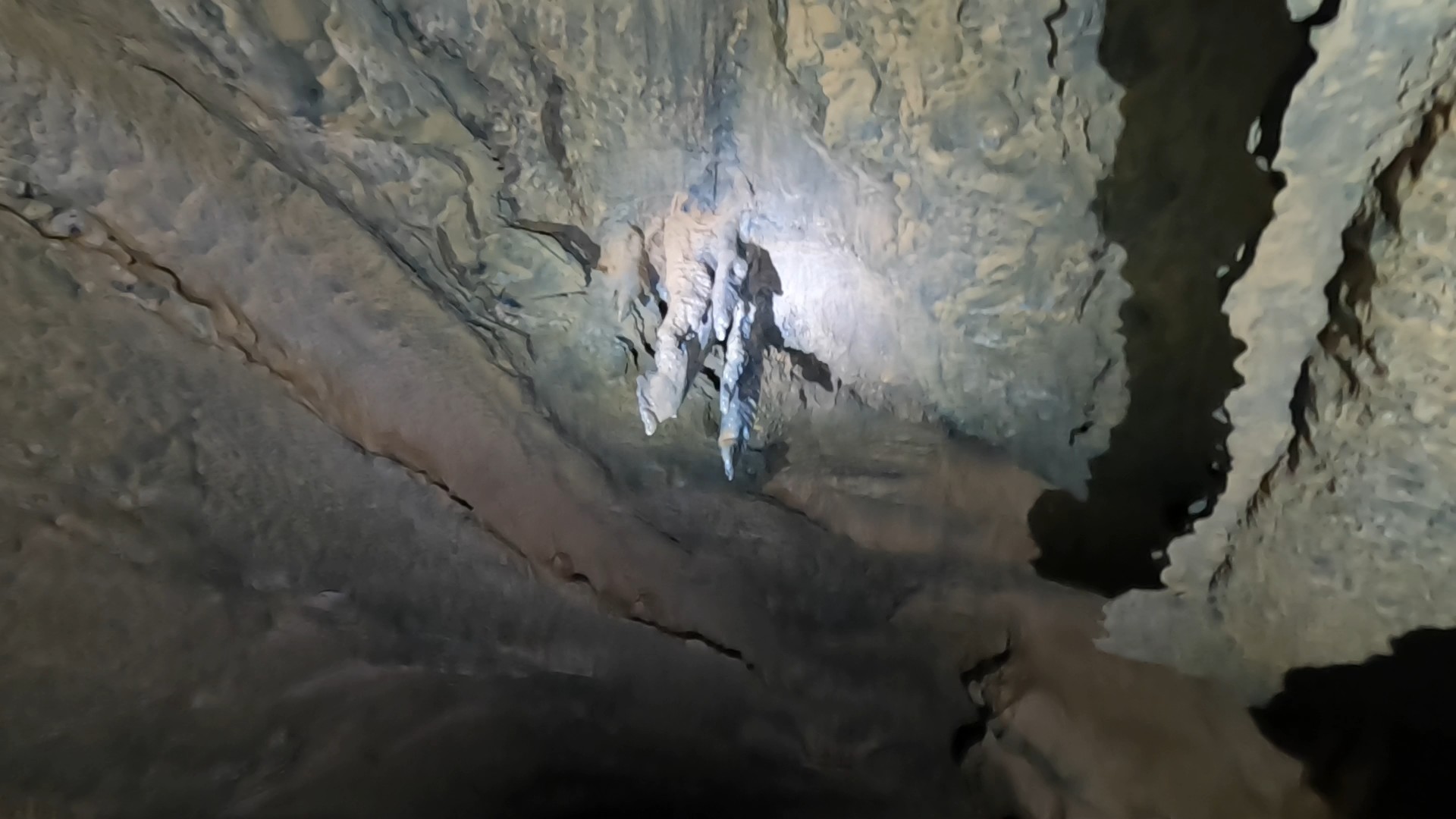 Die Verhältnisse in der Höhle waren unverändert. Wir fuhren mit den Scootern über die Galerie de blocs, nahmen die obere Passage und fuhren weiter bis in die tiefere Zone. Ab dann gaben wir ordentlich Gas, um die Dekozeit kleinstmöglich zu halten. Nach etwa 45 Minuten Tauchzeit sind wir am unteren Ende der imposanten Puit Hasenmayer in einer Tiefe von 77m angekommen. Leine gab es hier keine mehr, es war aber nicht schwer, den oberen Gang in etwa 43m zu finden. Dort gab es wieder Leine und wir fingen mit der Deko an. Die 80 Minuten Dekompressionspflicht vergingen schnell und wir konnten endlich im Lac Isler, 1,85km vom Eingang entfernt, auftauchen und die trockene Passage erkunden, die im Lac T endet. Diese Passage wird nicht ohne Grund die CO2-Promenade genannt, denn dort herrscht eine CO2-Konzentration von 4,6 bis 4,8%. Vor Ort war es gar nicht so schlimm. Wir haben uns wohl gefühlt. Nur bei der späteren Auswertung des Videomaterials merkten wir, wie schnell wir geatmet hatten. Die CO2-Promenade weist faszinierende Verkarstungserscheinungen und Lehmformationen auf. Es gibt sogar einige Stalaktiten, die ich in der Ressel für unmöglich gehalten habe. Nachdem wir den Lac T erreichten und genügend Filmmaterial hatten, war es an der Zeit, die Rückfahrt anzutreten.