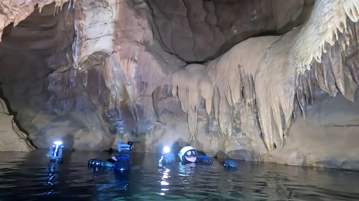 Die Fontaine de la Pescalerie ist eine Tauchhöhle besonderer Art. Der Eingang am Berghang hinter der Ruine einer alten Mühle mit einem dazugehörigen Wasserfall stellt ein idyllisches Fotomotiv dar. Das Besondere an dieser Höhle liegt aber darin, dass sie eine der wenigen Tauchhöhlen im Lot ist, die mit Tropfsteinen dekoriert ist. Auch die delikaten Lehmformationen an den Wänden sind in dieser Region nur selten zu finden. Vor einem aufgeregten Publikum bestehend aus Kindern, Eltern und Hausbesitzern tauchten wir am Donnerstag kurz nach 11 Uhr im Becken der Mühle ab. Wir waren sehr vorsichtig, keinen Schaden mit den Flossen oder dem Tauchgerät anzurichten und konnten die Tauchstrecken und Auftauchstellen weitgehend erkunden, bis es zu eng für unsere dicken Rebreather wurde. Es war ein besonderer Abschluss für unseren schönen Ausflug.