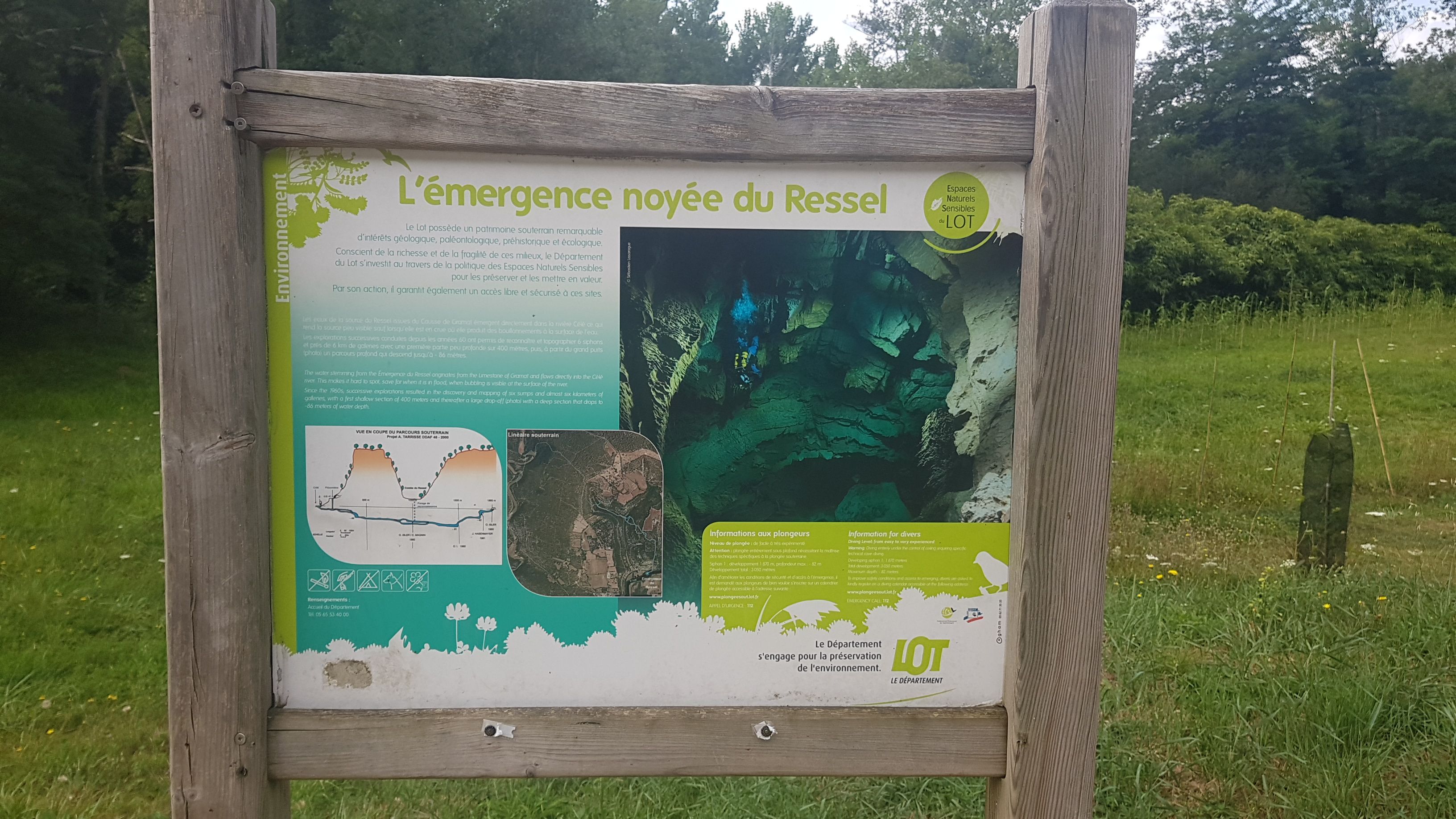 Am Samstag besuchten wir die Émergence du Ressel am Fluss Célé in der Nähe von Marcilhac-sur-Célé. Sie ist wohl die bekannteste und meistbesuchte Tauchhöhle Europas. Diesen Titel hat sie wohlverdient, denn die Ressel eignet sich hervorragend für das Höhlentauchen auf allen Niveaus. Anfänger finden eine flache, großräumige und gutmütige Höhle mit wenig Sediment oder Engstellen vor. Erfahrene Höhlentaucher können sich in den 5860m Passagen entlang von 6 Siphons mit Tiefen bis 80m richtig austoben.