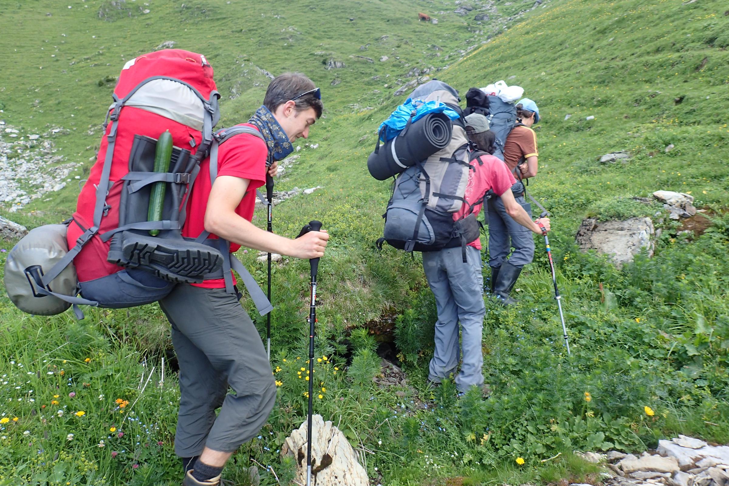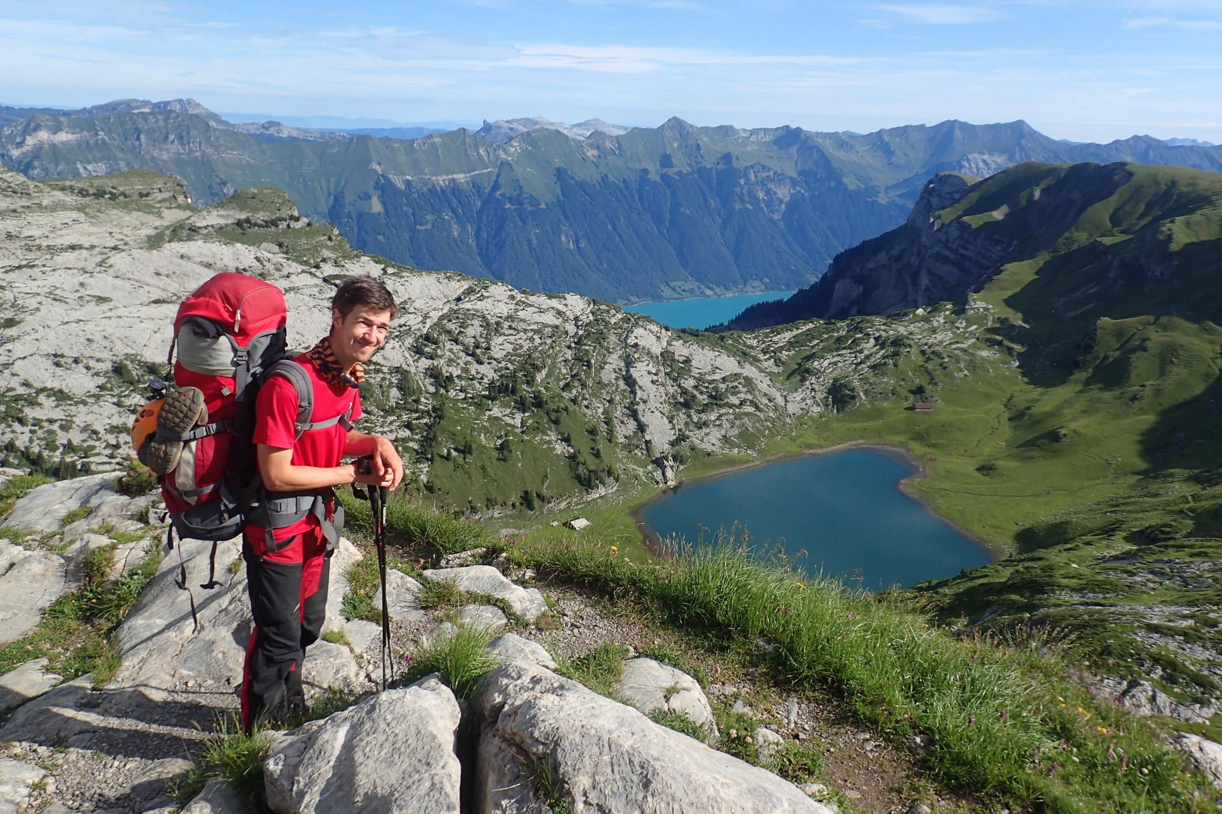 Durch unseren Aufenthalt in der Schweiz haben Lisa und ich eine recht kurze Anreise und wir fahren nach einer Bergtour direkt weiter nach Interlaken, wo wir Norbert und Rebecca am Bahnhof abholen und mit ihnen in Richtung Grindelwald zum Oberläger fahren. Auch wenn es auf der einsamen Hütte am Sägistalsee noch deponierte Verpflegung geben soll, haben wir reichhaltigen Proviant gekauft, der nun allerdings 500 Höhenmeter auf den Sattel hoch und auf der anderen Seite wieder 400 hm nach unten zum See gebracht werden muss. Schwer bepackt mit Ausrüstung und Verpflegung für eine Woche treten wir daher den Fußmarsch zum Gasthaus Männdelen an. Es ist wirklich nicht das erste Mal, dass ich mit „viel“ Gepäck zu Fuß in den Bergen unterwegs bin, aber noch nie war mein Rucksack so schwer. Mit geschätzt 25 bis 30 kg schleichen wir den Berg hinauf und sind froh beim Gasthaus zumindest unsere Höhlenausrüstung deponieren zu können. Da wir am nächsten Tag in der Gegend um den Sattel nach Höhlen suchen wollen wäre es unsinnig alles immer wieder hoch- und herunter zu tragen und die Depotlösung ist ideal.