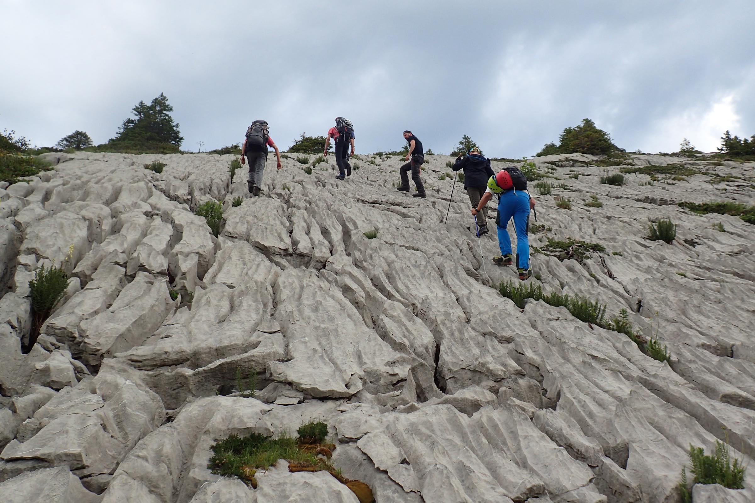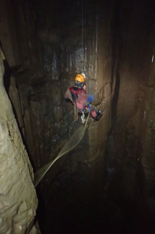 Der Montag steht ganz im Zeichen der weiteren systematischen Erkundung des Karrenfeldes „Schränni“. Das Potential hier neue Höhlen zu finden scheint riesig. Das Gestein ist bilderbuchmäßig verkarstet und sieht aus wie von Riesen „aufgerissen“. Überall gehen Spalten in die Tiefe, mal mehr, mal mehr weniger breit. Unsere Suchkette wird schnell unordentlich, da mal hier mal dort jemand in einer Kluft steckt und nach einer Fortsetzung sucht oder gar gräbt. Trotzdem sind wir recht erfolgreich und entdecken einige Höhlen, die dank ungenauer GPS- oder ganz fehlender Koordinaten in den vergangenen Jahren unauffindbar waren sowie eine Hand voll neuer Objekte. Spannend wird es am Objekt D128. Es ist keine Neuentdeckung, aber es gibt bisher wenige Informationen dazu. Gurtzeug an, Helm auf und schon hänge ich am Ende eines 20 m Seils, dass zur Überraschung aller nicht lang genug ist. Im schrägen Schacht seile ich auch bis ans Ende des zweiten kurzen Seils. Ein Ende ist nicht in Sicht. Eine kurze Peilung mit dem DistoX zeigt: Der Schacht ist mindestens 43m tief. Leider haben wir kein langes Seil dabei und müssten auch mehrere Fixpunkte bohren um sicher weiter zu kommen, daher bleibt der Schacht ein Projekt für das nächste Mal. Wieder Übertage angekommen räumen Lisa, Kermit und ich noch zwei große Blöcke aus dem Eingangsbereich, was den Einstieg in den Schacht erleichtert.