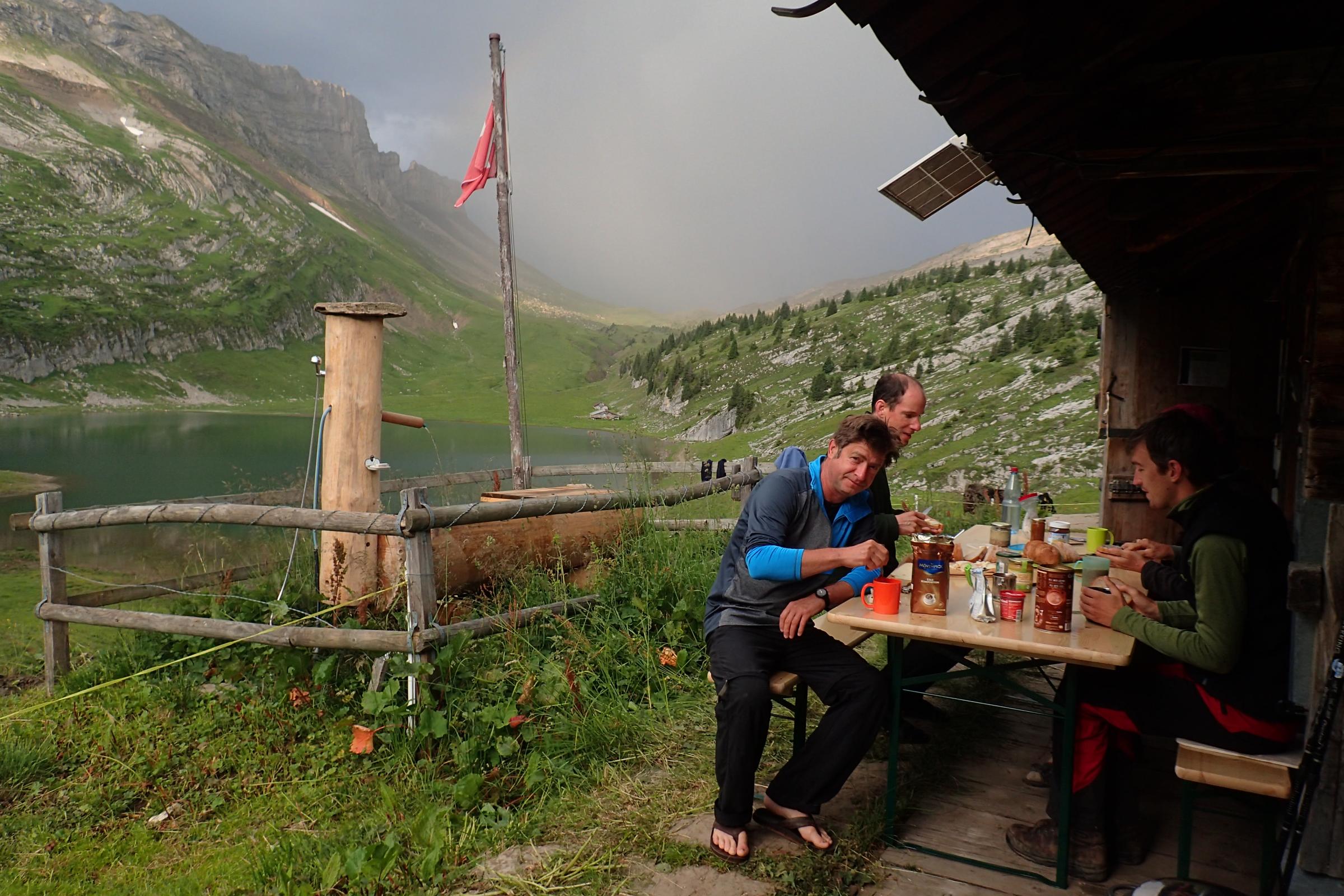 An der Hütte am See angekommen werden wir von Fischern begrüßt, die als Teil der „Bergschaft“ in dem ausgebauten Teil auf der Hütte weilen. Unsere Schlafstatt wird für die nächsten Tage ein Teil des Stalls sein, in dem wir uns einrichten und die deponierten Dinge sichten. Neben Kochern, Benzin und allerlei Nützlichem gibt es sogar ein Solarpanel mit LED Lampe. Damit wird der Stall fast luxuriös eingerichtet. Mit typisch Schweizer Rösti und Suuremost (Apfelwein) klingt der Abend aus.
