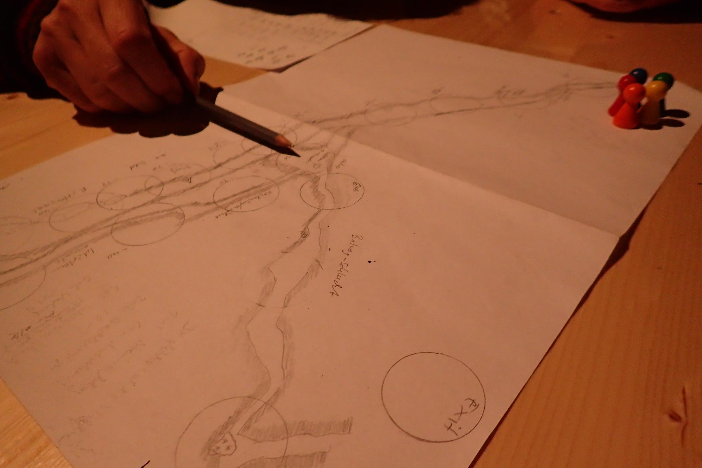 Am Abend stellen uns Norbert und Frank das Höhlenspiel vor. Es ist eine Adaption eines Brettspiels französischer Höhlenforscher, die den Plan einer Höhle zum Spielfeld gemacht haben. Aufgabe: Die Höhle so weit wie möglich „erkunden“ aber rechtzeitig wieder draußen sein, bis die Akkus alle sind oder die Alarmzeit überschritten ist. Es war ein toller Abend, mit vielen „Steinschlag: du musst leider eine Runde aussetzen“ oder „Schlossern: Du musst dich hoch-spitten, setze drei Runden aus“ Aktionen und mehr oder weniger erfolgreichen Papierhöhlenforschern, die sich durch die „L1“ Höhle kämpfen. Nachdem der französische Rotwein alle wurde, konnten wir von dem erfahrenen Ardèche Besucher Frank den „blas-den-Weinschlauch-auf“ Trick lernen und weitere Milliliter gewinnen.