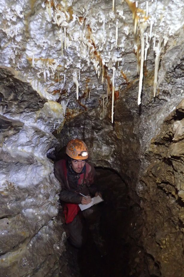 Das Wetter bleibt auch am nächsten Tag regnerisch und Rebecca, Lisa und ich fahren in einer Regenpause in das angeblich stets staubtrockene Alpvogtloch ein. Hier wollen wir den Mäander „Entschädigung“ vermessen und eine Fortsetzung der Höhle in dieser Richtung abklären. Wir merken recht schnell, dass die Höhle nach Regen eher einem großen Schlammloch gleicht und kommen dank der mäandrierenden Gänge nur langsam voran. Am Ziel angekommen, bilden wir ein kleines Vermessungs- und Fototeam und arbeiten unter Rebeccas fachkundigen Augen mit ihrem DistoX. Der Umgang mit dem Gerät ist einfach, das händische Zeichnen des Plans erfordert aber viel Übung. Hier muss ich noch mehr Erfahrung sammeln um schneller und sicherer zu werden. Wir können weitere 150 m Gang vermessen bis wir vor dem verschlossenen Ende knien. Wir treten den Rückweg an und bauen alles aus. Völlig verlehmt, nass und frierend fahren wir aus und sind glücklich, dass die Höhle damit zumindest „abgeschlossen“ ist.
