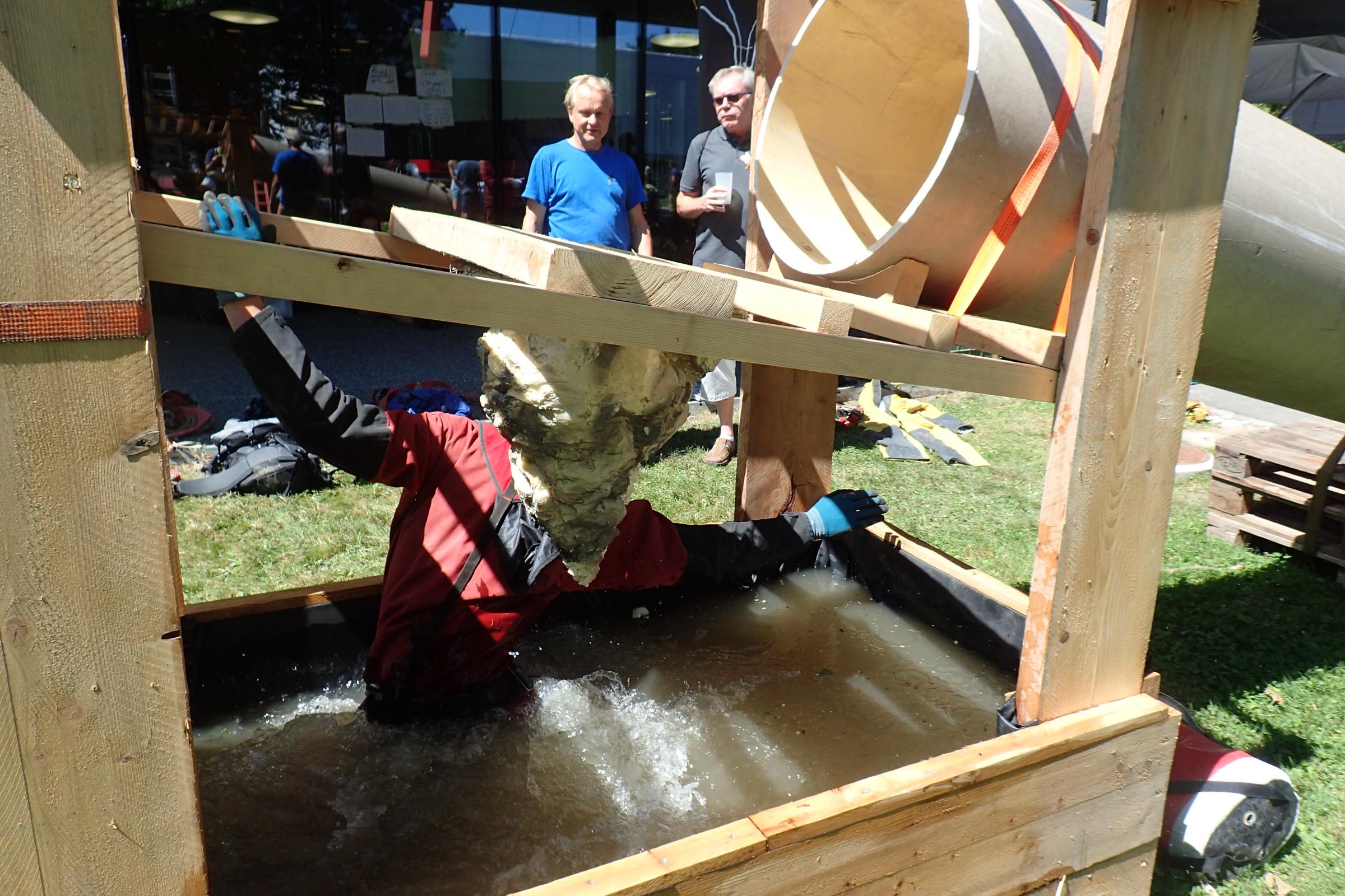 Nebenbei gab es Wettbewerbe zum Höhlenplanzeichnen, mit meterlangen, bunten, detailreichsten Plänen, zu Fotografie in Höhlen und die SpeleOlympics, einen Parcours der es in sich hatte. Durch eine enge Röhre schlufen, ins Wasserbecken und den verlorenen Schleifsack (voll mit Steinen) einsammeln, dabei den Tropfstein nicht beschädigen, weiterschlufen, eine Schrägseilbahn nach oben steigen, „runterfahren wäre ja zu einfach“, eine luftige Traverse zwischen Bäumen absolvieren, abseilen und durch eine Zick-Zack-Engstellen-Schlufbox zum Ziel, alles auf Zeit. Rebecca als unglaublich fitte Höhlenforscherin hat es dabei sogar ins Finale geschafft. Ich war immerhin unter den besten 10 – damit war ich doch ziemlich zufrieden.